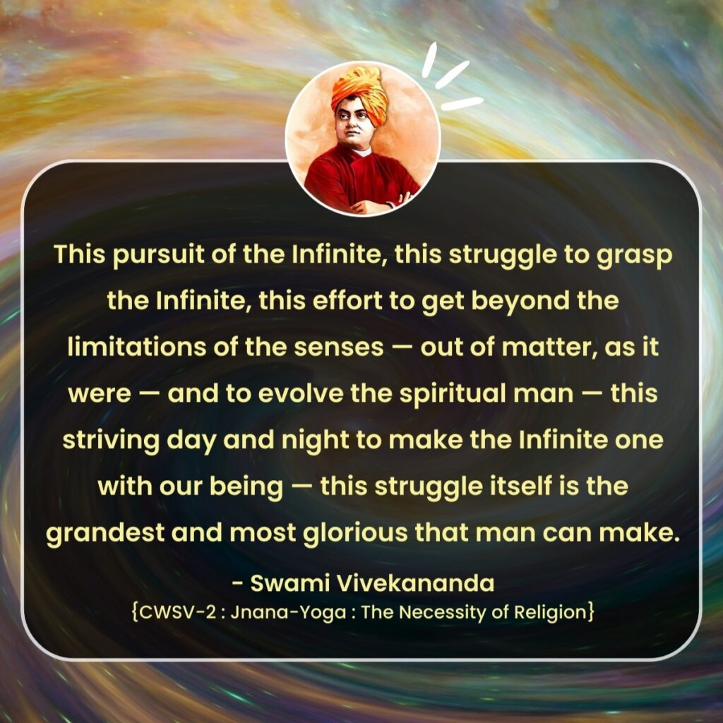 - This pursuit of the Infinite, this struggle to grasp the Infinite, this effort to get beyond the limitations of the senses — out of matter, as it were — and to evolve the spiritual man — this striving day and night to make the Infinite one with our being — this struggle itself is the grandest and most glorious that man can make.[Source]