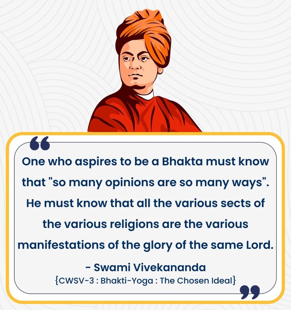 - One who aspires to be a Bhakta must know that “so many opinions are so many ways”. He must know that all the various sects of the various religions are the various manifestations of the glory of the same Lord.[Source]