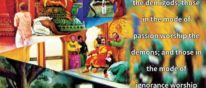 यजन्ते सात्त्विका देवान्यक्षरक्षांसि राजसा: |प्रेतान्भूतगणांश्चान्ये यजन्ते तामसा जना: || 4|| yajante sāttvikā devān yakṣha-rakṣhānsi rājasāḥpretān bhūta-gaṇānśh chānye yajante tāmasā …