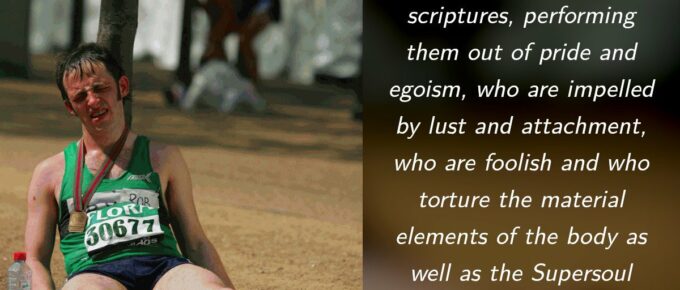 अशास्त्रविहितं घोरं तप्यन्ते ये तपो जना: |दम्भाहङ्कारसंयुक्ता: कामरागबलान्विता: || 5||कर्षयन्त: शरीरस्थं भूतग्राममचेतस: |मां चैवान्त:शरीरस्थं तान्विद्ध्यासुरनिश्चयान् || 6|| aśhāstra-vihitaṁ ghoraṁ …