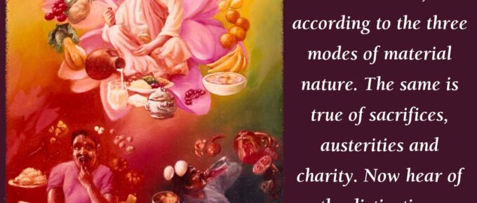 आहारस्त्वपि सर्वस्य त्रिविधो भवति प्रिय: |यज्ञस्तपस्तथा दानं तेषां भेदमिमं शृणु || 7|| āhāras tv api sarvasya tri-vidho bhavati priyaḥyajñas tapas tathā dānaṁ teṣhāṁ bhedam imaṁ …